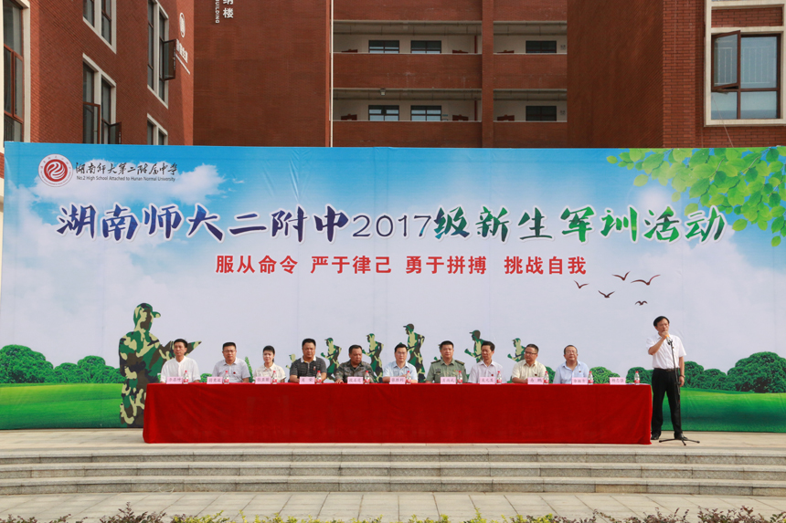 8月27日7点45分,我校高一新生军训动员大会在田径场召开。出席此次活动的领导有:望城区人武部副部长肖尚武中校,望城区人武部政工科科长段石虎中校,湖南师大第二附属中学校长张胜利老师,副校长吴元其老师,副校长肖荣老师,副校长易鹏老师,财务总监张亚丽女士,校党支部副书记、教科室主任余柏青老师,校长助理、教务处主任符竞波老师,校长助理、艺体部主任李昌坤老师。此次动员大会由我校学生处主任杨志强老师主持。