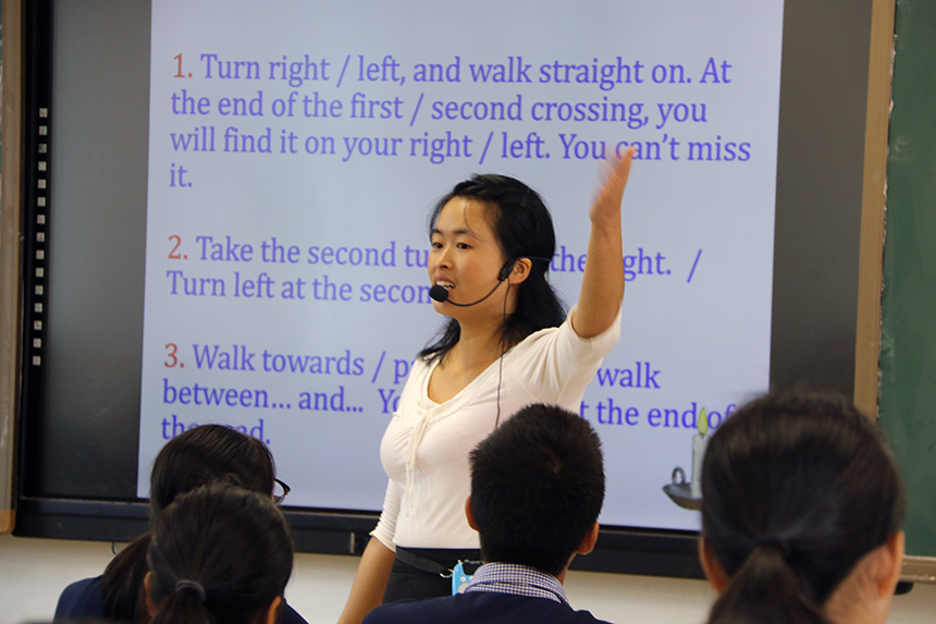 英语教师夏芳艳全程用英语教学,生动活泼、课堂气氛好。
