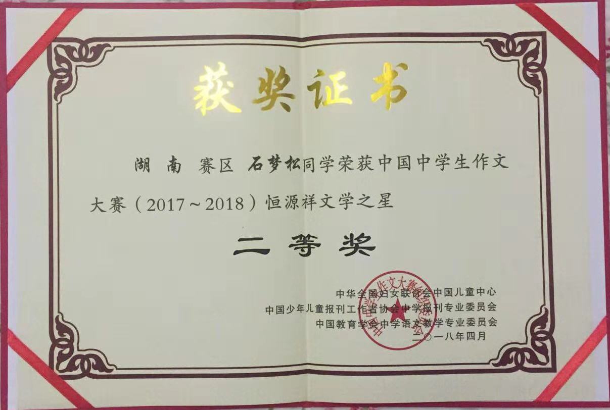 海量阅读喜结硕果,作文大赛捷报频传。中国中学生作文大赛组委会传来喜报,我校1702班石梦松同学荣获(2017~2018)恒源祥文学之星湖南赛区一等奖,全国二等奖,其获奖作品发表在《高中生》杂志上。2018年第34届武汉国际楚才作文竞赛结果揭晓,我校1608班龚文宜同学荣获全国高中总决赛一等奖,并获得“文学特长生”荣誉称号。