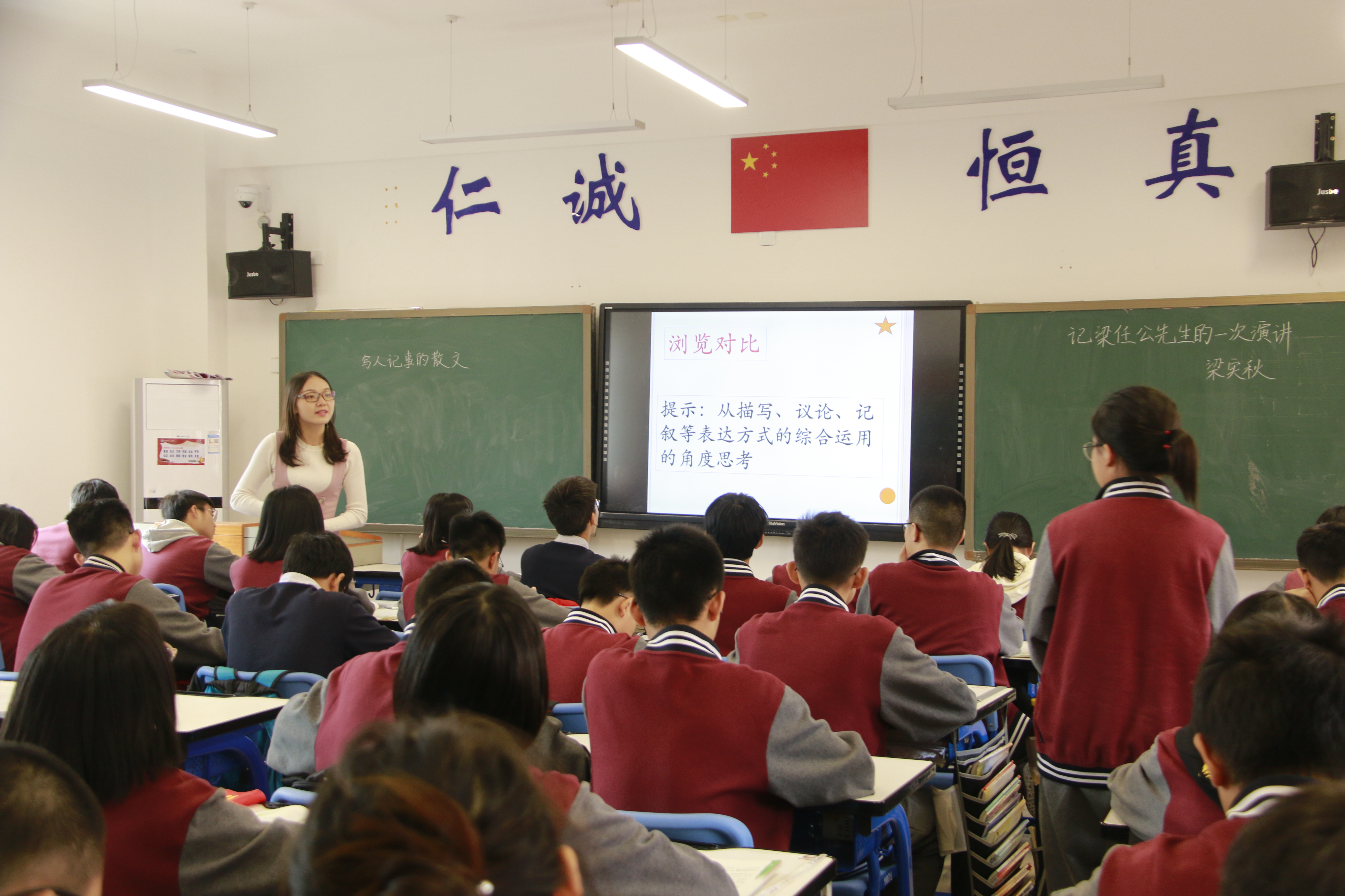 此次汇报课授课内容为《记梁任公先生的一次演讲》。课堂上,高钰霞向同学们展示了本堂课的教学目标,接着请李泽宇同学上台演讲,并请其他同学以“记李泽宇同学的一次演讲”为题做口头作文,以其与课文的对比作为切入点正式进入教学。高钰霞在此次课堂中采用自分教学模式,通过学生自学、组内互帮、成果展示、教师释疑等几个环节进行授课,将学、说、做、记四种学习行为落实到课中。整堂课气氛活跃,学生反响良好,展示了实习队在二附中一个多月来的实习成果。