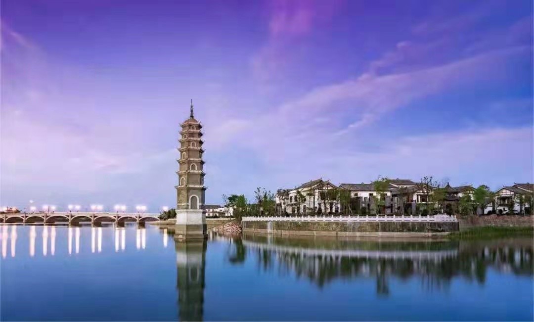 图中的半月牙河湾两畔林木茂盛,这是生态防护隔离带。