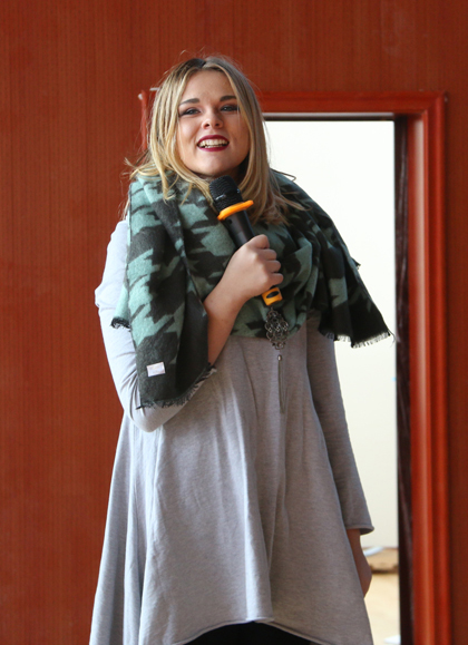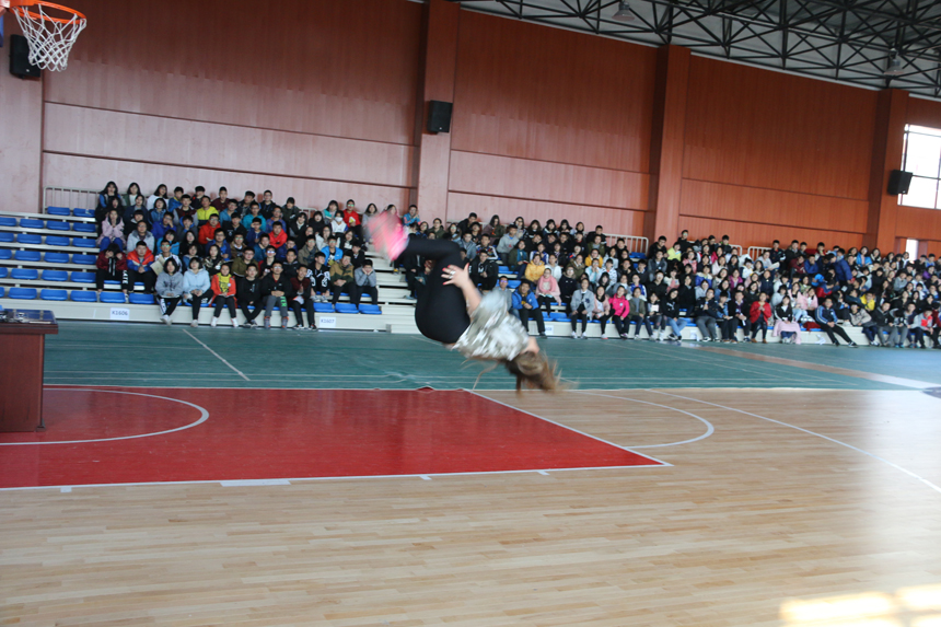 活动开始,在外教Lindsey老师和我校胡梦溪老师轻松幽默的主持氛围中,外教们阳光靓丽、大方自信的自我介绍和美国风土人情简介。外教JC老师即兴展示美国杨百翰大学(Brigham Young University)啦啦队队长经典动作——原地后空翻;在外教Jennifer的热情感染下,全场师生齐跳神曲PPAP,场面壮观。外教老师在与师生交流的过程中介绍了美国感恩节文化的由来、发展及庆祝方式,讲解生动有趣、精彩纷呈。