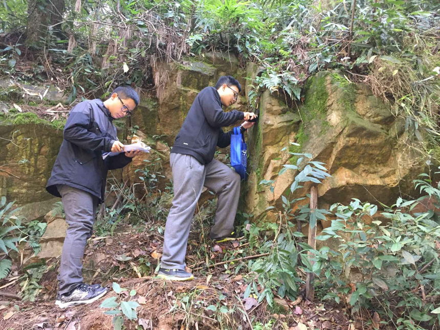 日近中午,考察组一行人来到了麓山寺旁的溪涧中进行了深入考察。我们了解到由于两侧山地抬升幅度的差异形成断层,从而出现了许多滚石,造就了溪涧现在的模样。