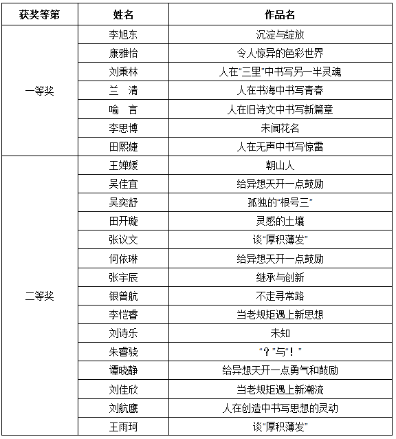 我校学生在第十二届全国中学生作文大赛湖南赛区“拓维教育麓山妙笔杯”作文比赛复赛中7人荣获一等奖、15人荣获二等奖,谨此向所有获奖同学表示热烈祝贺!希望同学们再接再厉,再创佳绩。