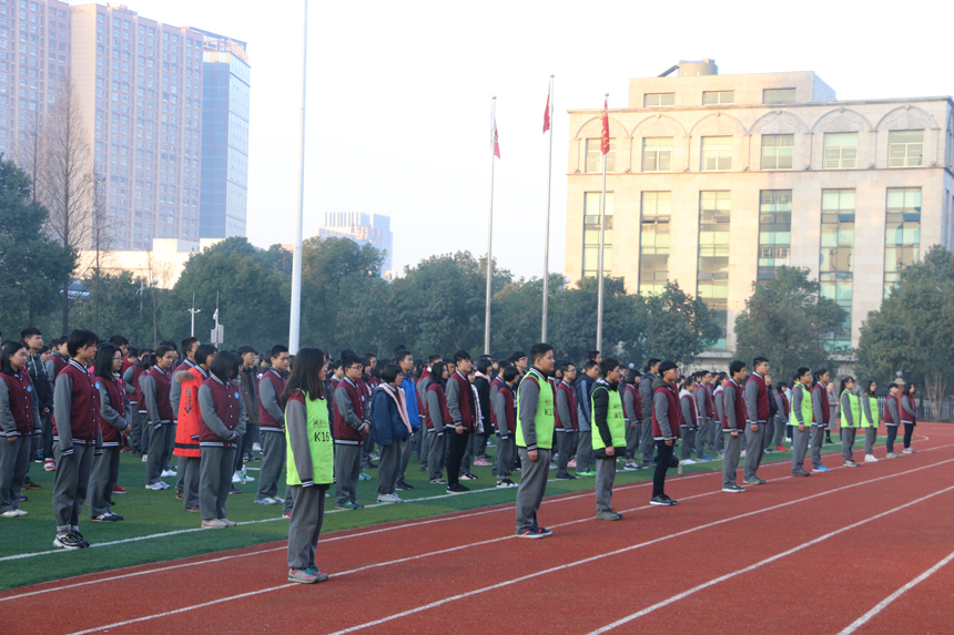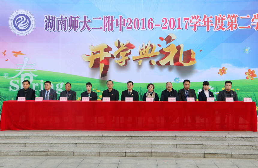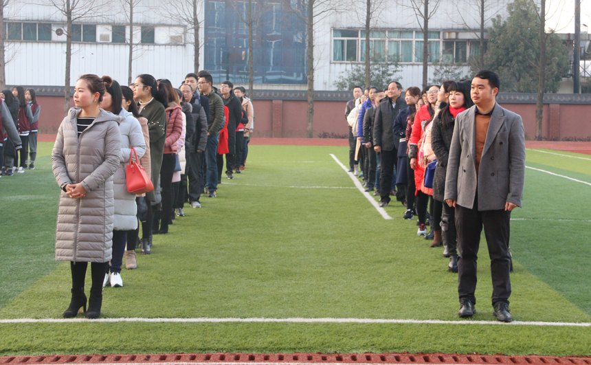 2月13日上午7点25分,我校2016—2017学年度第二学期开学典礼在田径场举行,校长张胜利,校监肖建新,校长助理余柏青、肖荣,财务总监张亚丽,总务主任李登华,教务处副主任符竞波,校办副主任陈可,学生处副主任任明,招生办副主任吴晴,2016级年级组长汤建明及家委会代表兰萍女士在主席台就坐,任明担任主持。