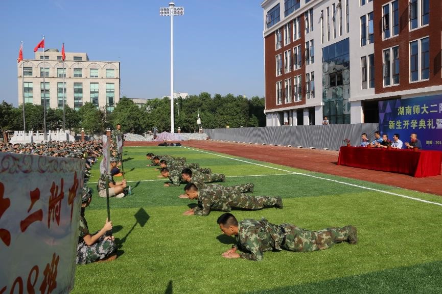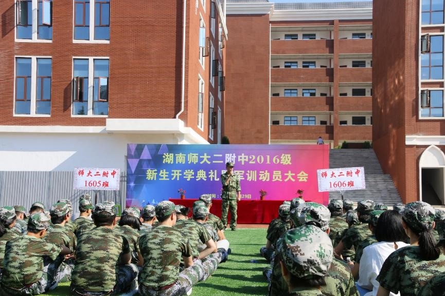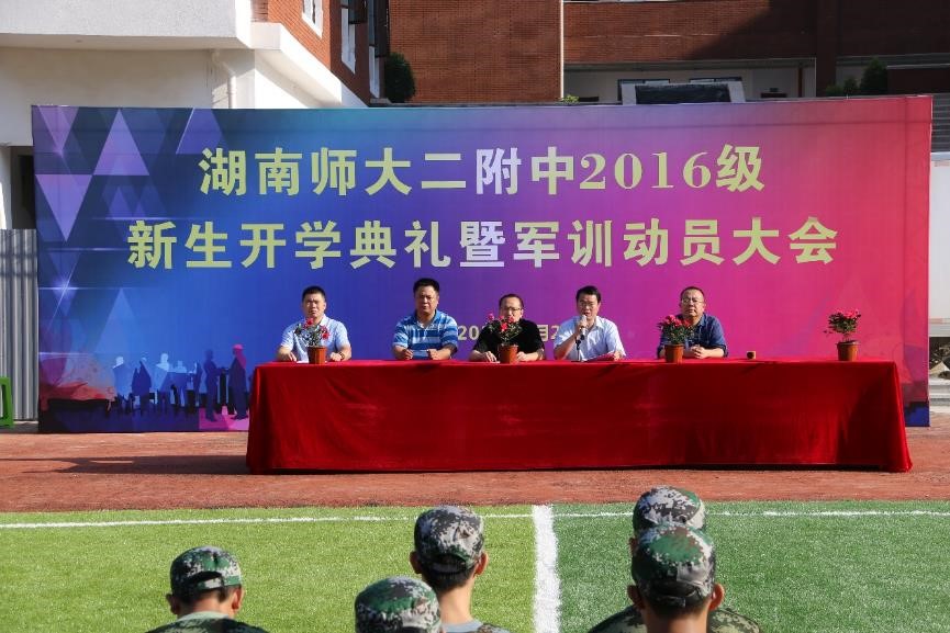 青春飞扬,绿草如茵。8月29日上午,湖南师大二附中开学典礼暨2016级新生军训动员大会在田径场举行。校长张胜利、副校长肖建新、校长助理余柏青、肖荣在主席台就座,2016级12个班全体师生参加大会。大会由学生处主任王虎主持。