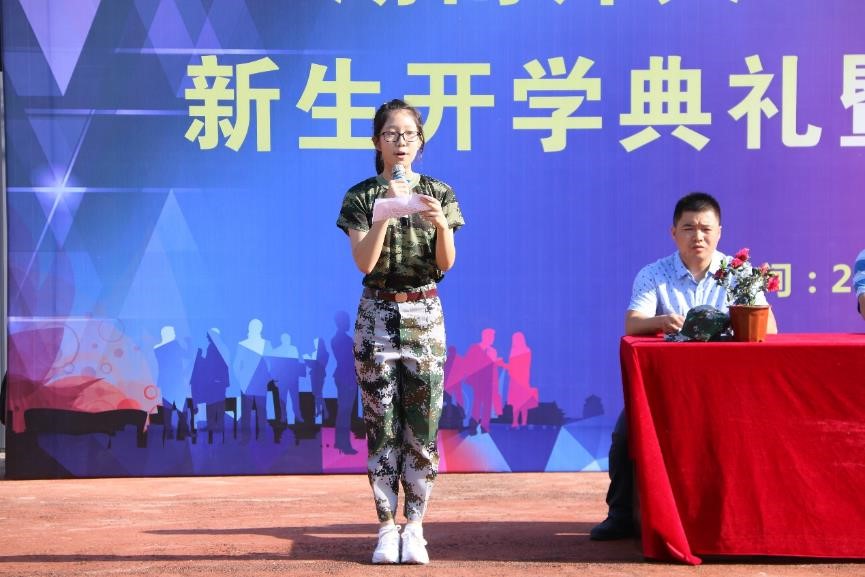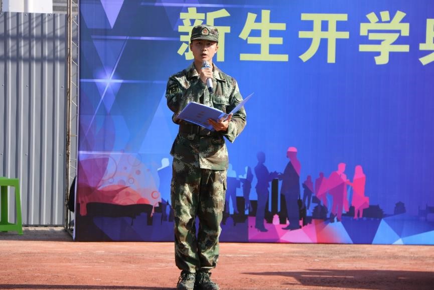1602班粟楦雅同学作为新生代表发言,立志在接下来的军训和学习中不怕苦不怕累,下定决心将以饱满的热情和昂扬的斗志投入到火热的军训中去。