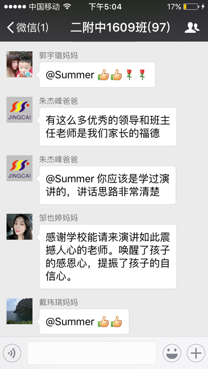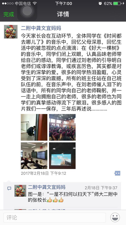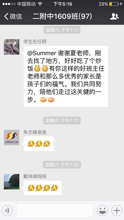 以1602班彭俊杰母亲及1608班祝帅宇母亲的心声为代表的家长留言,让我校的老师们深受感动和鼓舞,感谢家长们对学校的理解与支持。我们把此时此刻的心情和文字记录下来,三年后,当孩子们展翅高飞时,今天的动人画面都将成为他们毕生难忘的回忆,这些真情流露的文字也将成为家长们陪伴孩子成长的足迹,成为二附中前行路上一道靓丽的风景线。