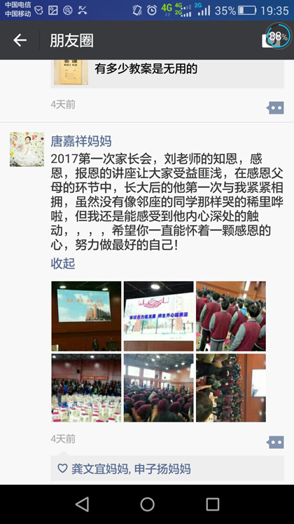 周六那天一大早赶到儿子学校去开家长会,我原以为跟以前的家长会一样,没什么特别之处,可是,迎接我们的是一次心灵的洗涤和触碰到灵魂深处的东西,很震撼人心,可又让人不可言说,无法言说,无一可言,却让人在一瞬间,不觉间就将自己内心的情感交付,随之泛滥的是泪水,想隐忍,隐忍后的结果是如决了堤的河,更不能自已。