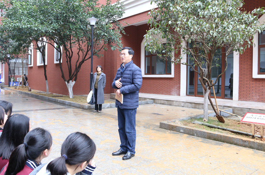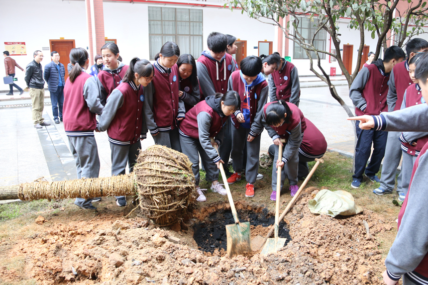 3月10日,湖南师大二附中高1605班班主任张伟平老师带领全班学生开展“爱树,育树”植树活动,在诚正楼前种下两颗银杏树,1605班周嘉奇同学主持,校长张胜利,校监肖建新,学生处主任任明出席。