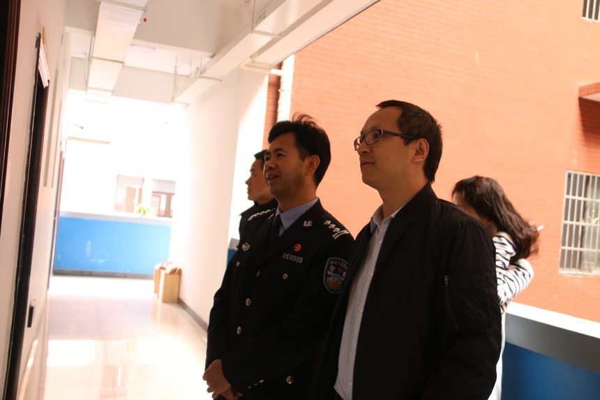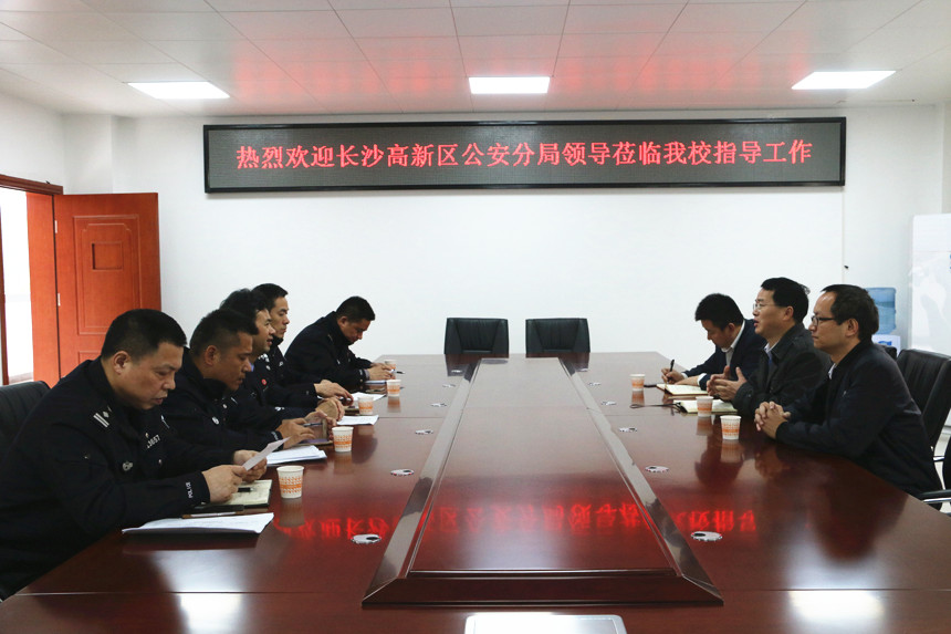 长沙高新区公安分局领导们查看了我校图书馆、教学楼、食堂、学生宿舍等安保设施建设情况后,听取了张胜利校长关于校园及周边安全工作情况和我校安全教育、法制教育的工作设想。肖建新介绍了学校通过强化安全教育,组织安保培训、消防演练等举措。