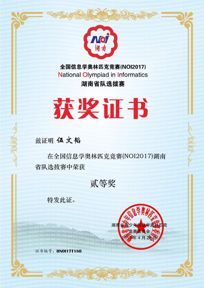 4月15日—16日在长沙理工大学云塘校区举行的全国信息学奥林匹克竞赛(NOI2017)湖南省队选拔赛中,我校1605班伍文韬、1607班王俊浩同学荣获贰等奖。