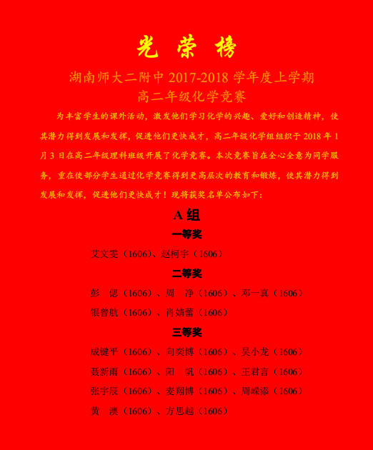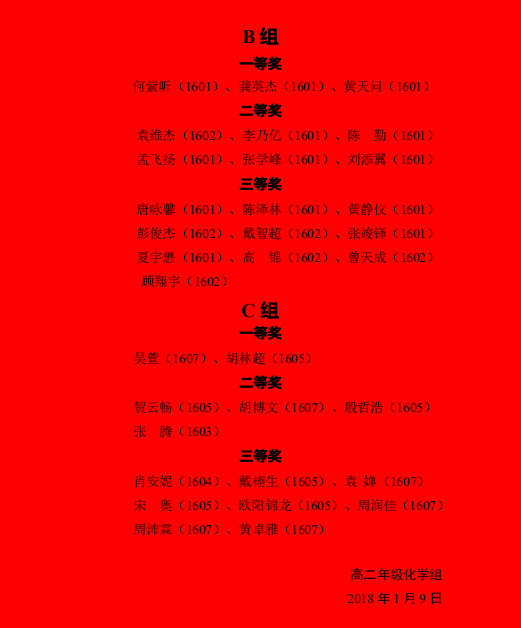 【光荣榜】2017至2018学年度高二年级化学竞赛获奖名单