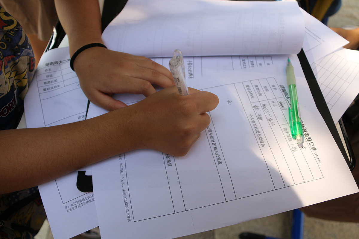 聚集在各个社团面前的同学们也神色各异,有的如同找到了组织一般激动得握着社团干事的手,开始填写报名表格;有的走马观花的左看看右看看,希望找到一个合适自己的社团。9月下旬的午后暑气渐消,但同学们对于此次活动的热情却依旧不减。
