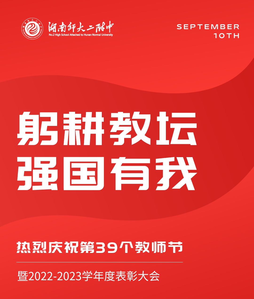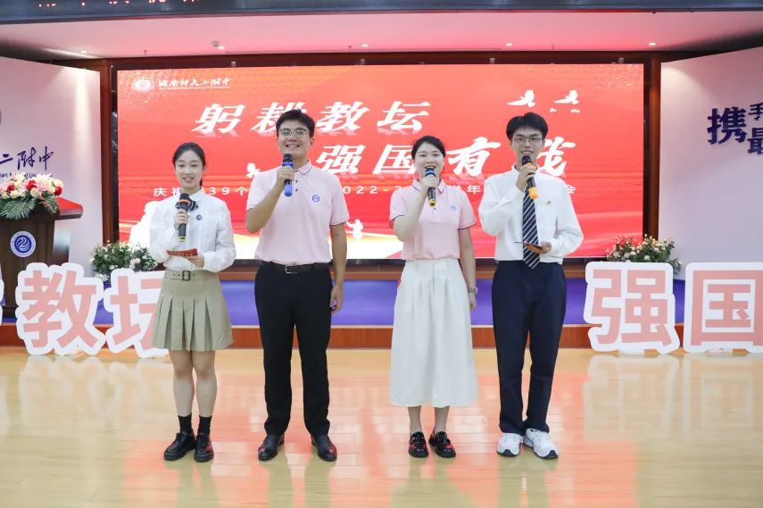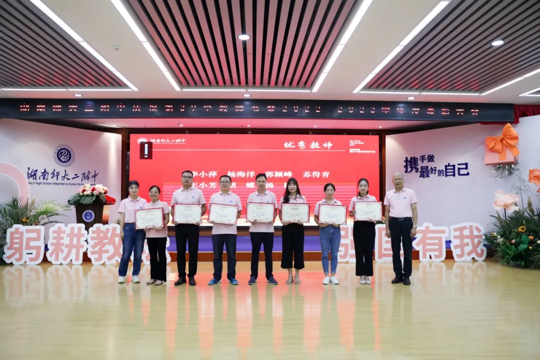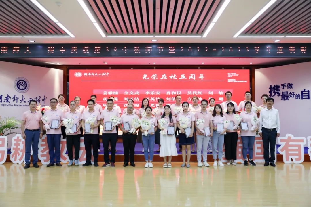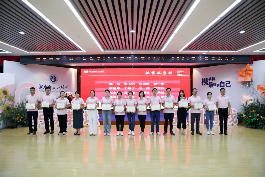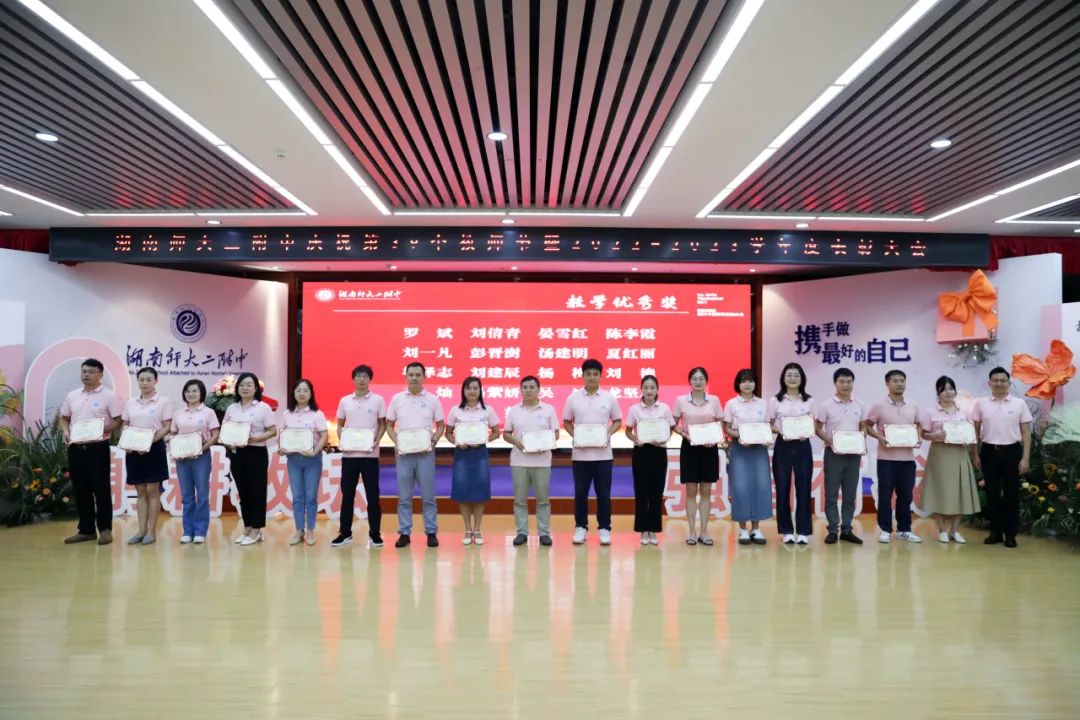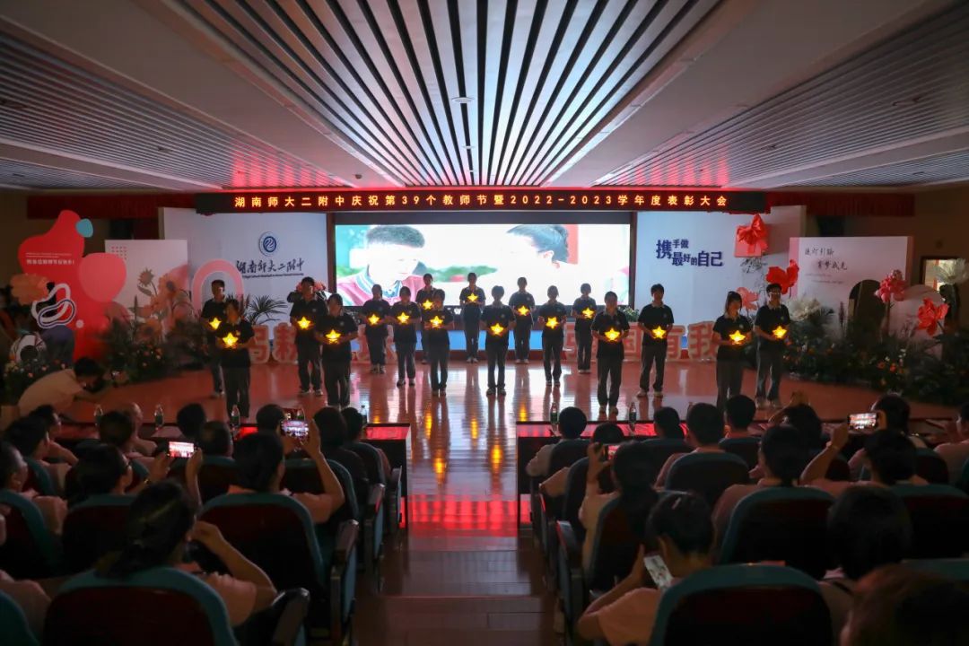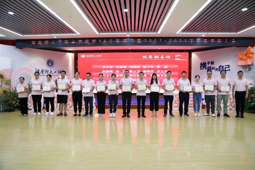 教坛耕耘志不渝,桃李芬芳又一年。9月9日下午,学校在格致楼八楼会议室举行庆祝第39个教师节暨2022-2023学年度表彰大会。湖南博纳教育集团董事长贺志力,二附中校长张胜利、校监张亚丽、副校长汪训贤、副校长张伟平出席本次大会。湘潭市博纳高级中学作为二附中同根同源的兄弟学校,执行校长田志刚、校长助理夏友才、校长助理李安定、校办主任姜美菊等领导受邀和学校全体教职工一同欢度教师佳节。