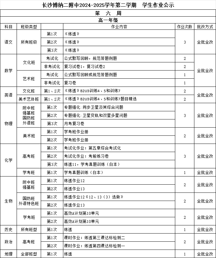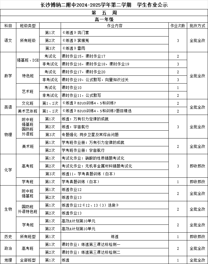 湖南师大二附中2021-2022学年第二学期学生作业公示(第三周)湖南师大二附中2021-2022学年第二学期 学生作业公示 第 三 周 高一年级 科目 作业内容 作业次数 适合班级 批改方式 语文 默写1次(全体学生);《素养提升训练》2次 (强基班全做,其