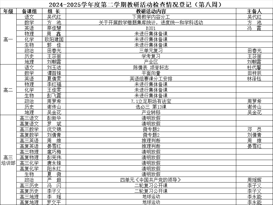 2024-2025学年度第二学期教研活动检查情况登记(第八周)
